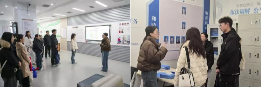 The delegation first conducted a field investigation and symposium at Yushui Community. Du Conghui, Secretary of the Party Branch of Yushui Community in Rongxi Area, systematically introduced the community's achievements and practical challenges in legal infrastructure development, with particular emphasis on the "135" working methodology for rule of law construction and the operational mechanisms and outcomes of characteristic governance projects such as the "Xiaoyu Mediation Team" and "Silver Age Guardian Unit." This investigation provided faculty and students with deeper insights into the legal demands and governance difficulties in relocated communities, establishing a foundation for subsequent targeted legal education initiatives.